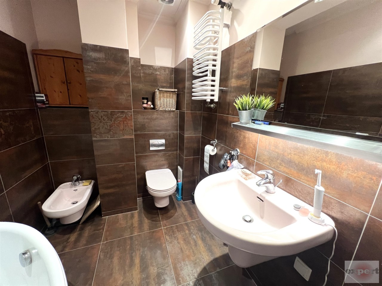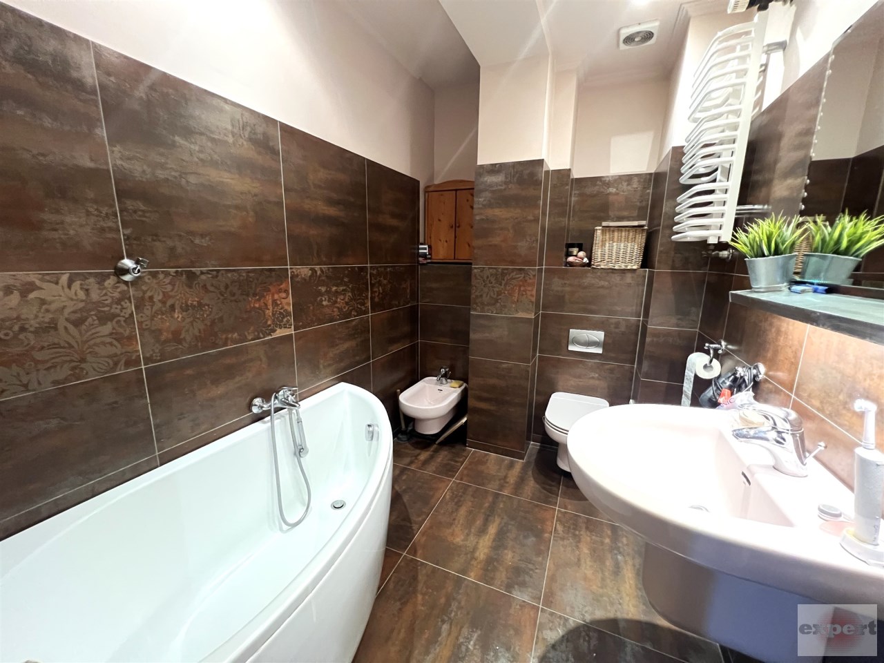 ŁAZIENKA - elegancki gres na podłodze i ścianie, sedes, bidet, wanna, lustro