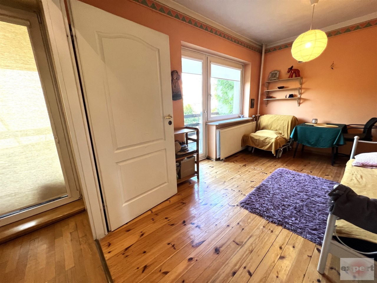 I POKÓJ 13,5 m - z szerokim przejściem do holu i BALKONEM, podłoga deski drewniane, ściany gładzie gipsowe, BALKON wyłożony terakotą