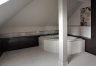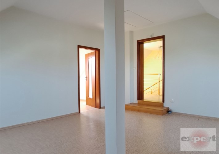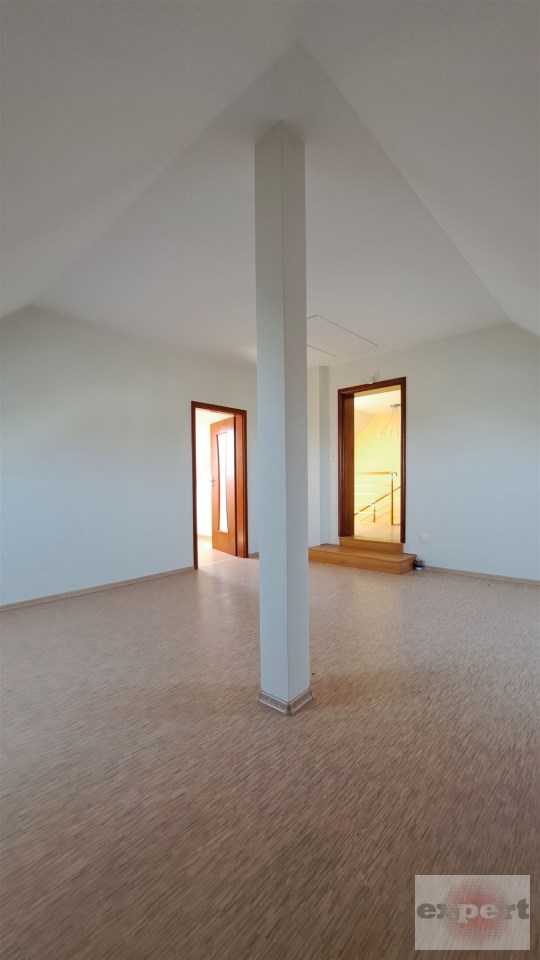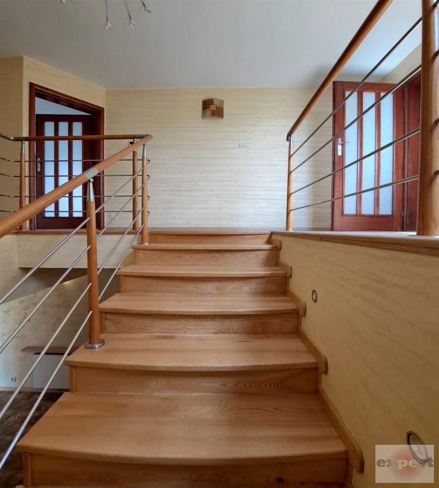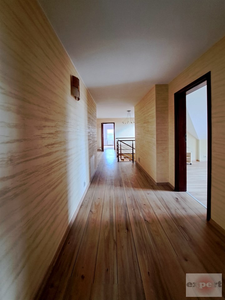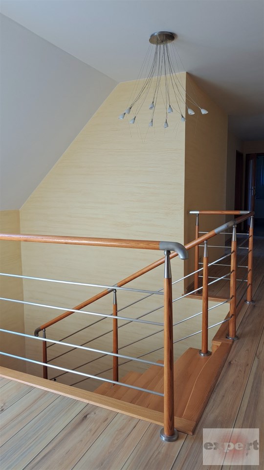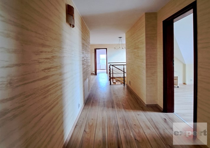 Kierując się schodami w górę znajdujemy się w holu kolejnej kondygnacji. Na piętrze znajdują się 4 pokoje, 2 garderoby, w tym jedną przynależną bezpośrednio do sypialni, 2 łazienki (z czego jedno z pomieszczeń stanowi pokój kąpielowy).