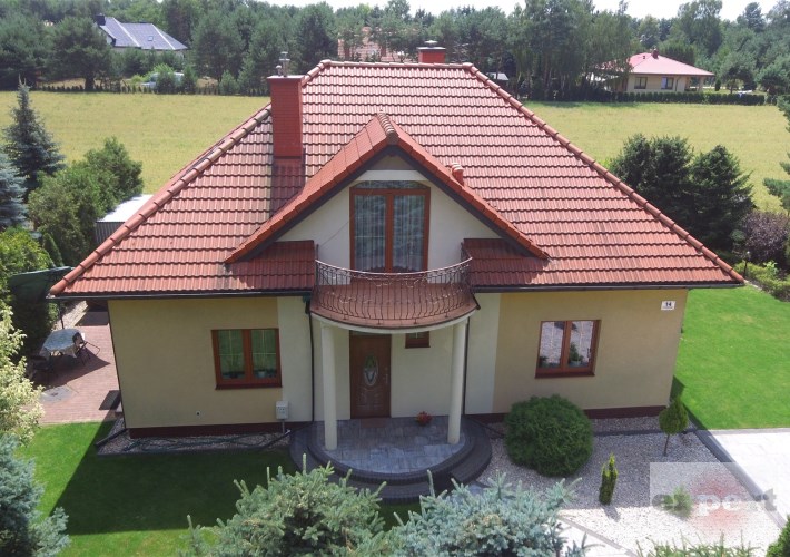 Dach pokryty jest dachówką ceramiczną w kolorze cegły.