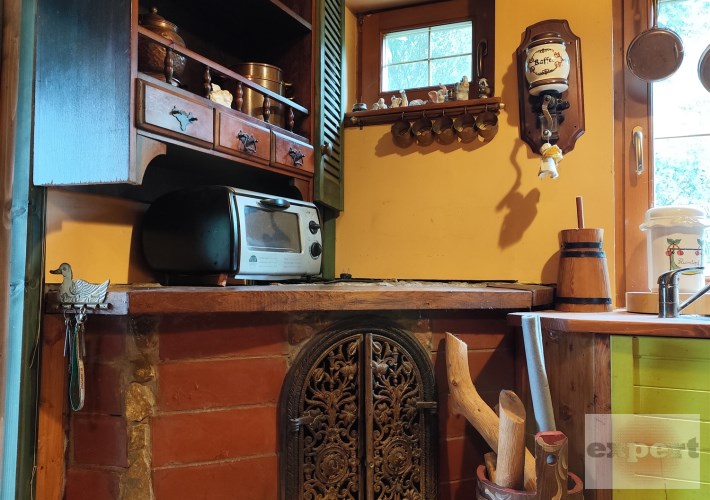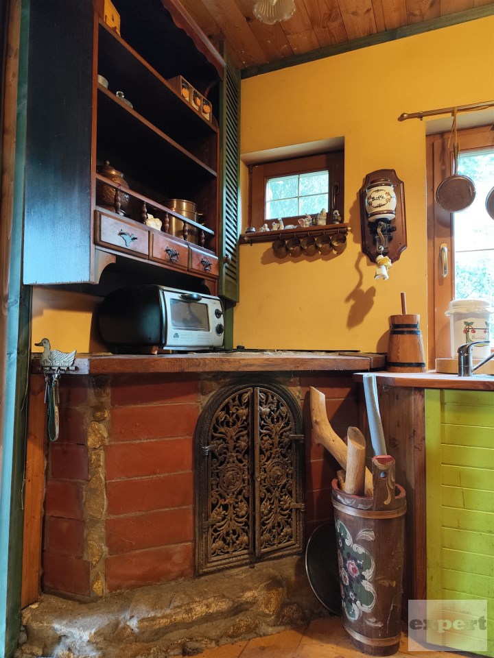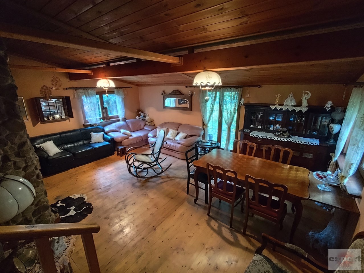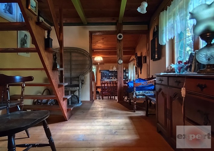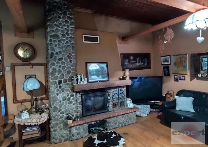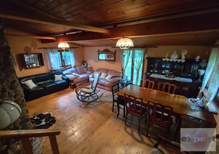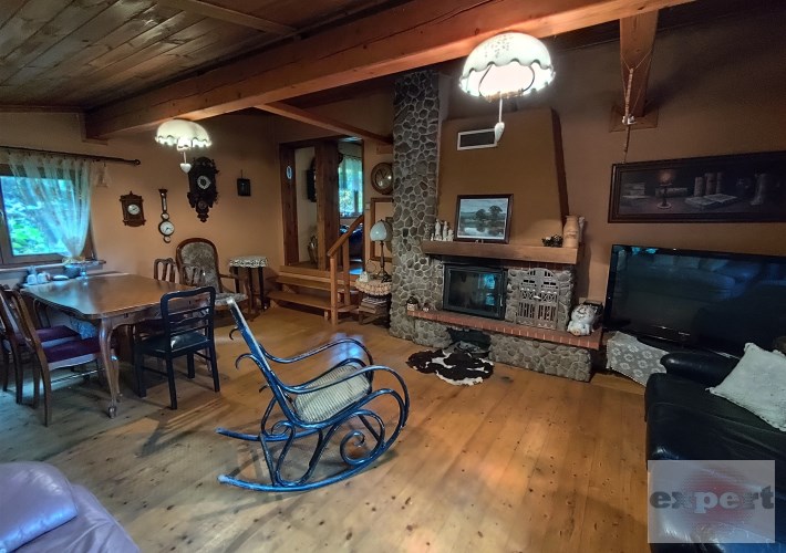 Dom posiada przestronny, klimatyczny salon z kominkiem, którego kamienna obudowa nadaje wnętrzu przytulny, góralsko-letniskowy charakter. Drewniane sufity i podłogi tworzą wyjątkowy nastrój, a liczne okna zapewniają naturalne oświetlenie oraz widok na otaczającą zieleń.