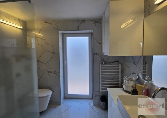 - Łazienka z natryskiem, utrzymana w nowoczesnym stylu,