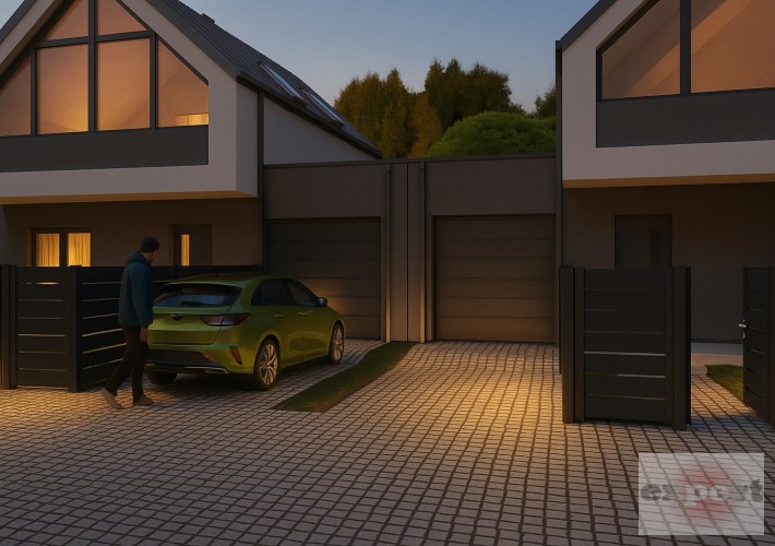 Każdy dom posiada garaż w bryle budynku, prywatny ogród oraz dodatkowe miejsce postojowe.