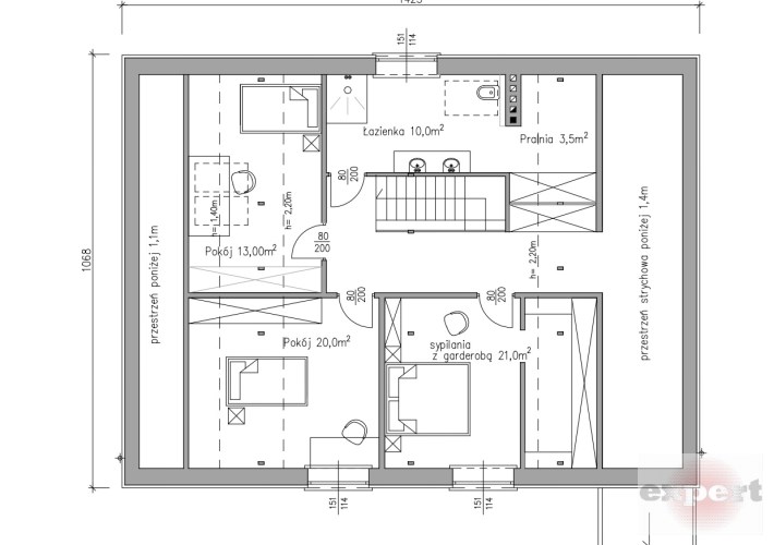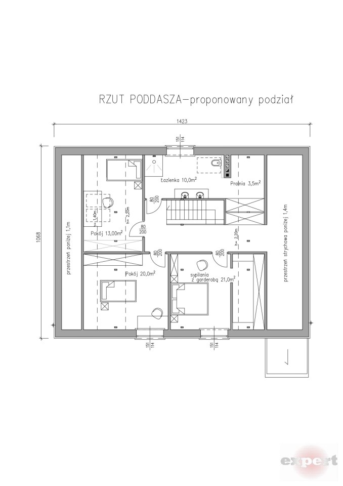 Poddasze (77 m²): możliwość aranżacji 3 pokoi, łazienki i pralni; dodatkowo strych