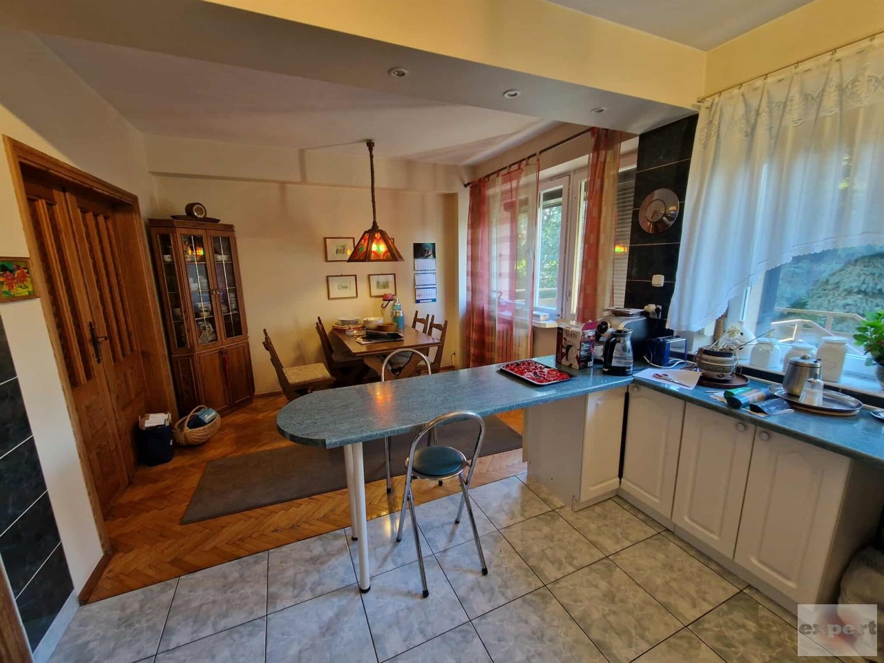 - jadania połączona z kuchnią ok. 20 m2, umeblowaną na wymiar i wyposażoną w sprzęt AGD, oddzielona od salonu dodatkowo dużymi podwójnymi drzwiami. Przy jadalni jest wyjście na taras z zejściem do ogródka.