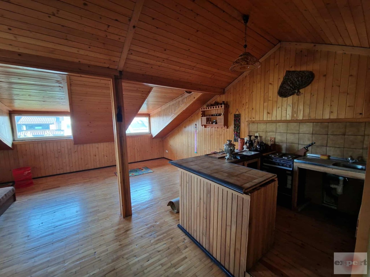 W mansardzie zostało zaaranżowane oddzielne mieszkanie z living room i kuchnią w aneksie (druga kuchnia w domu) oraz łazienką. Układ dodatkowego mieszkania jest w amfiladzie prowadzi do kolejnej sypialni.