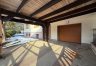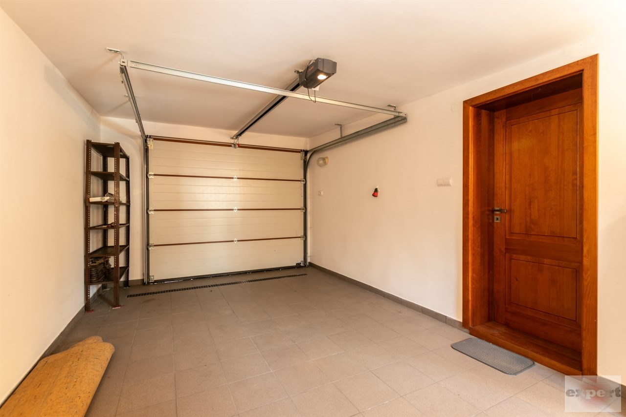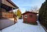 Garaż w bryle budynku oraz mały domek gospodarczy.