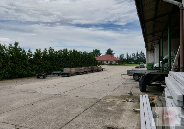 Powierzchnia placu 2500 m2. Parking utwardzony z automatyczną bramą wjazdową dla samochodów ciężarowych, rampa z regulowaną wysokością do załadunku towaru.