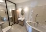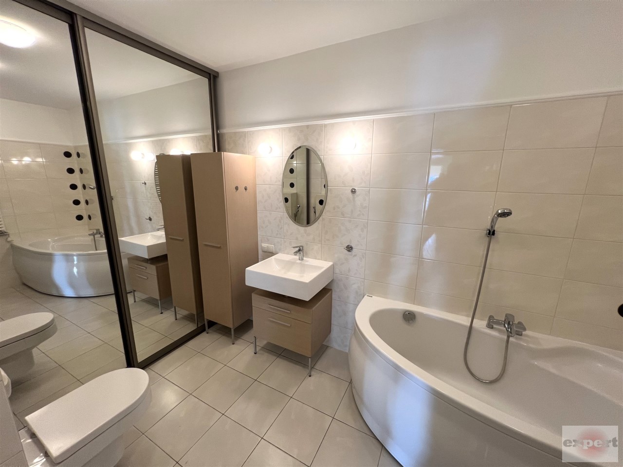 - ŁAZIENKA I, z wanną i prysznicem: 12,44 m², obok głównej sypialni, z wanną narożną i kabiną prysznicową, pralnia oddzielona drzwiami przesuwnymi z lustrem, przygotowane podłączenie pralki oraz słuchawka bidetowa,