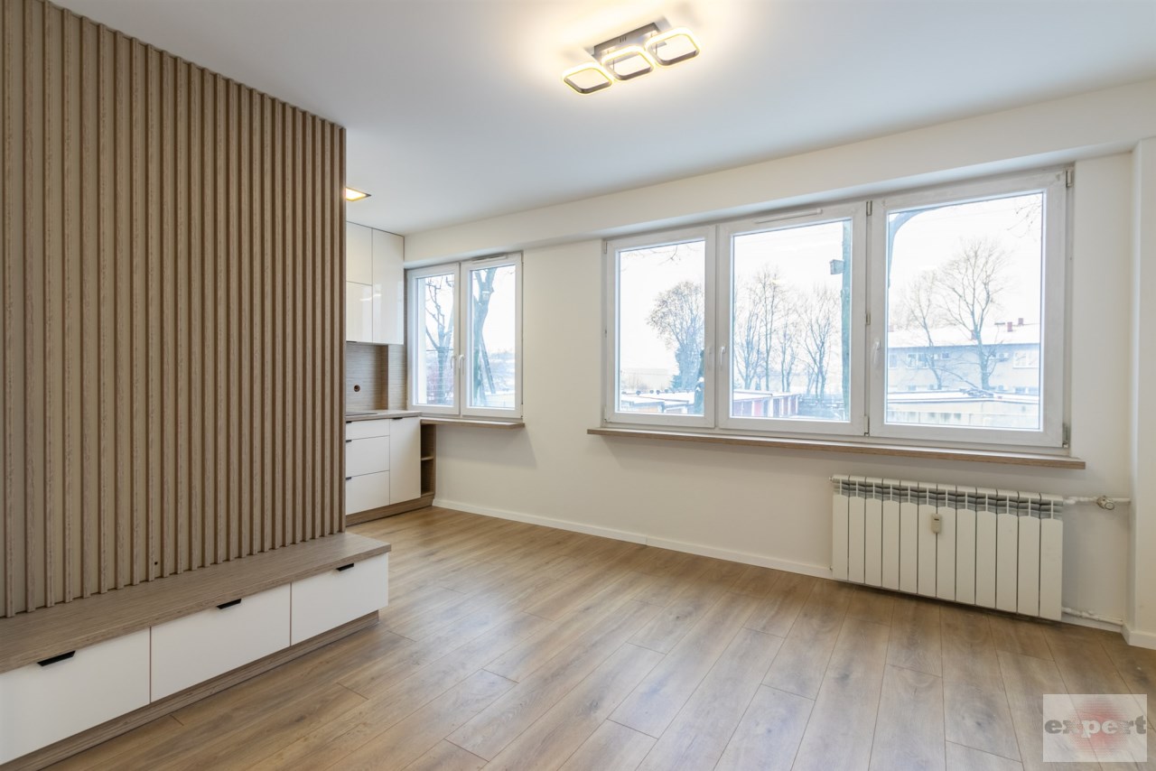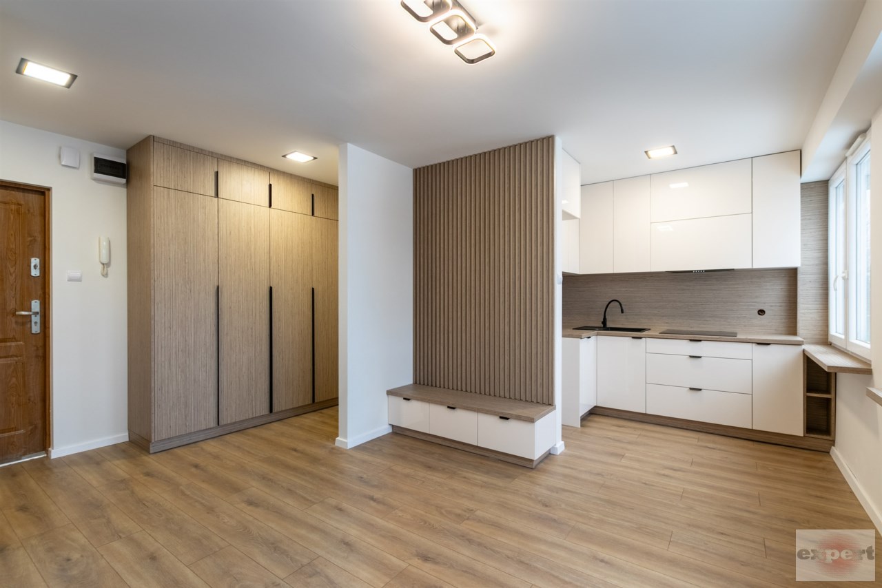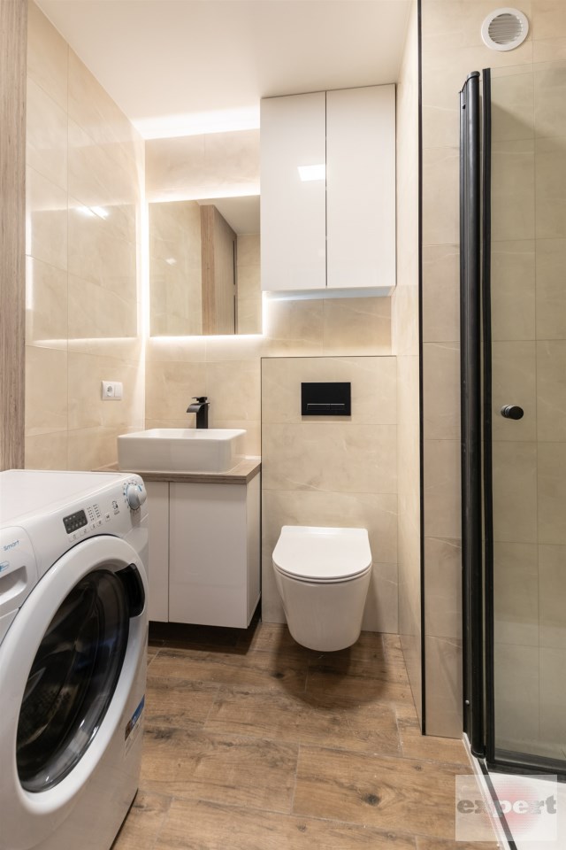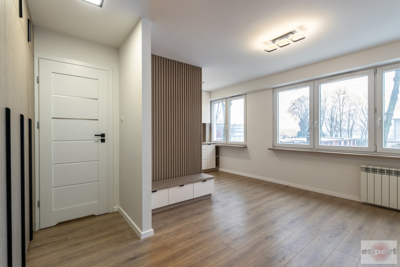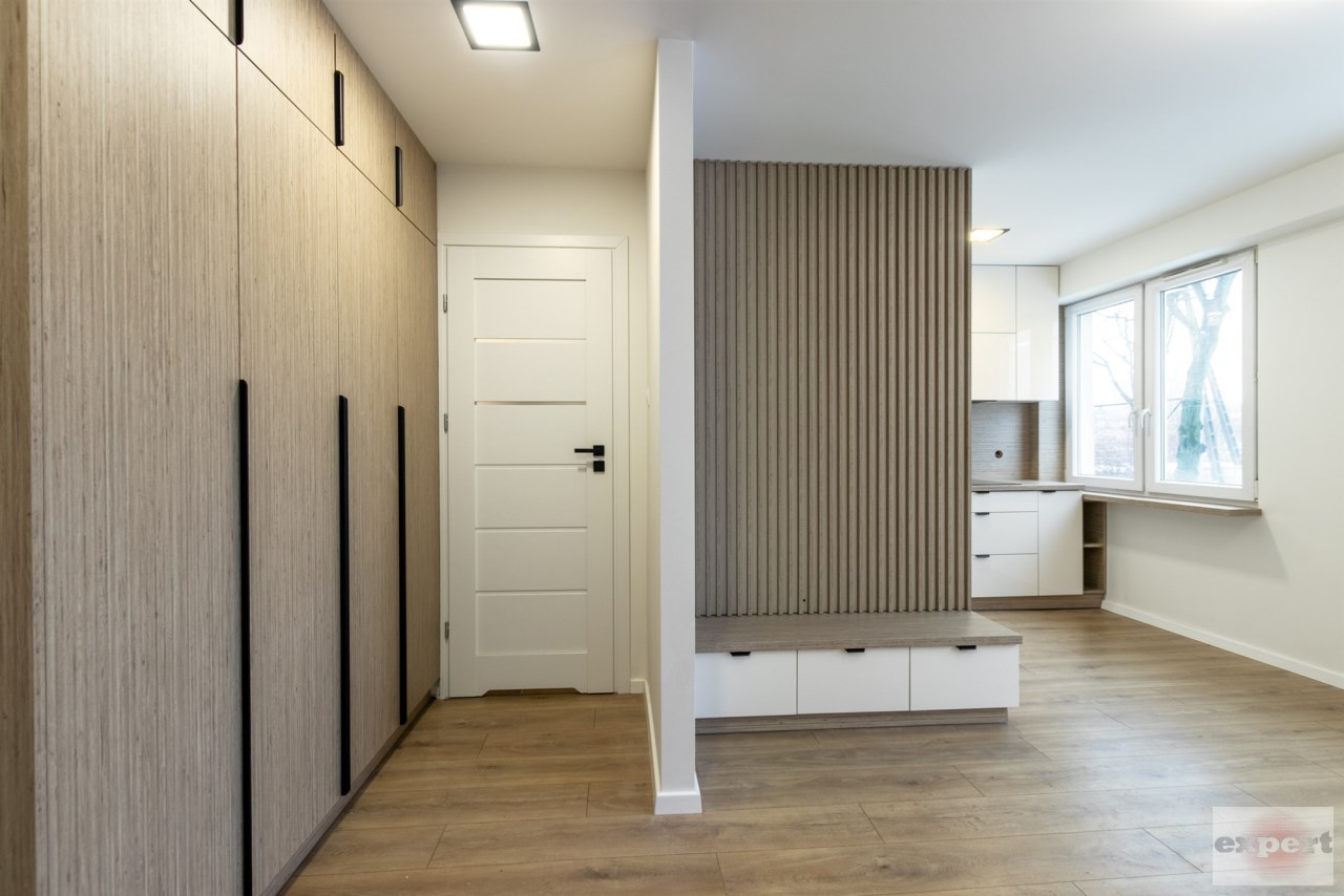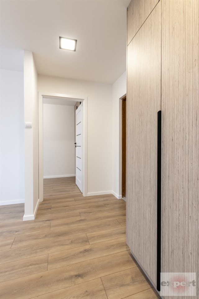 W mieszkaniu na podłogach panele, w części korytarzowej i kuchni płytka podłogowa.