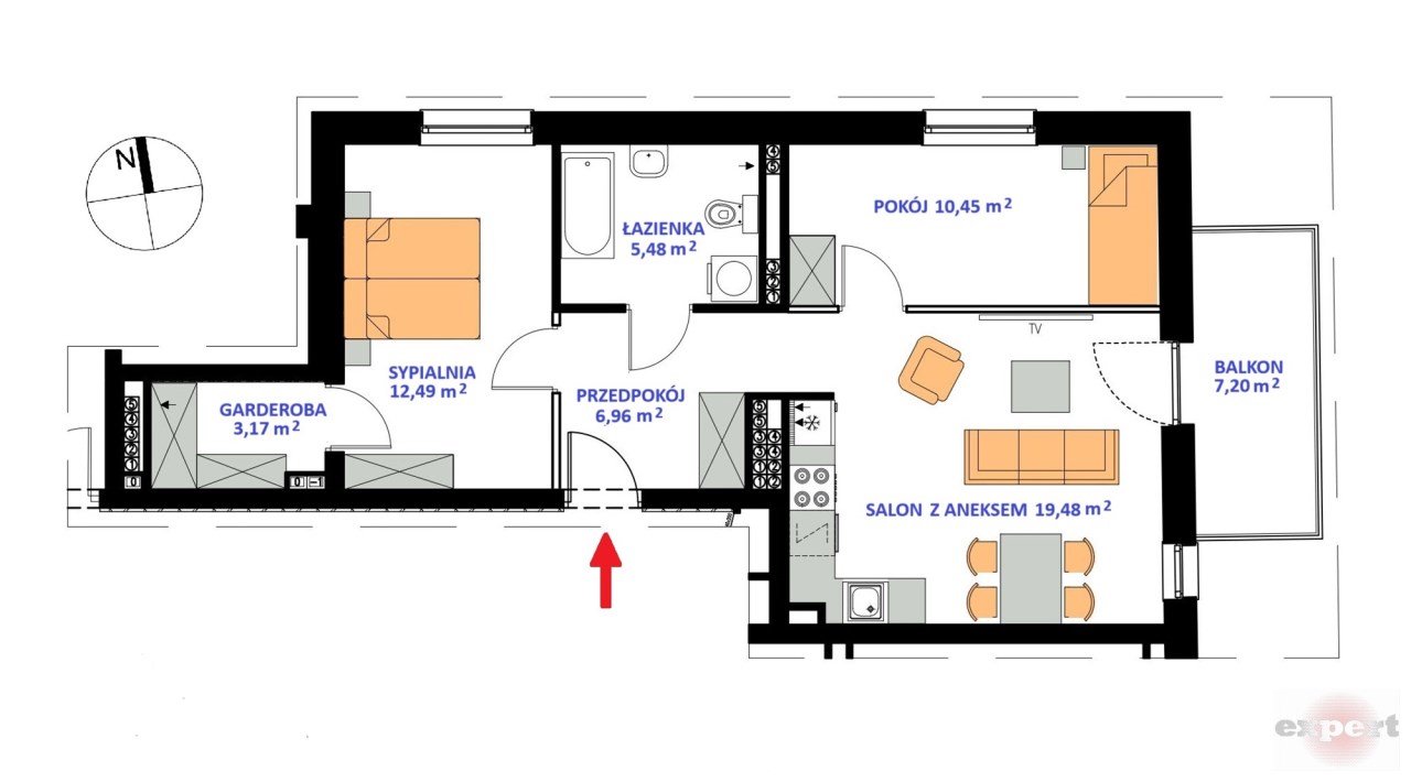 - SALON Z ANEKSEM KUCHENNYM: 19,48 m², wyjście na duży balkon,