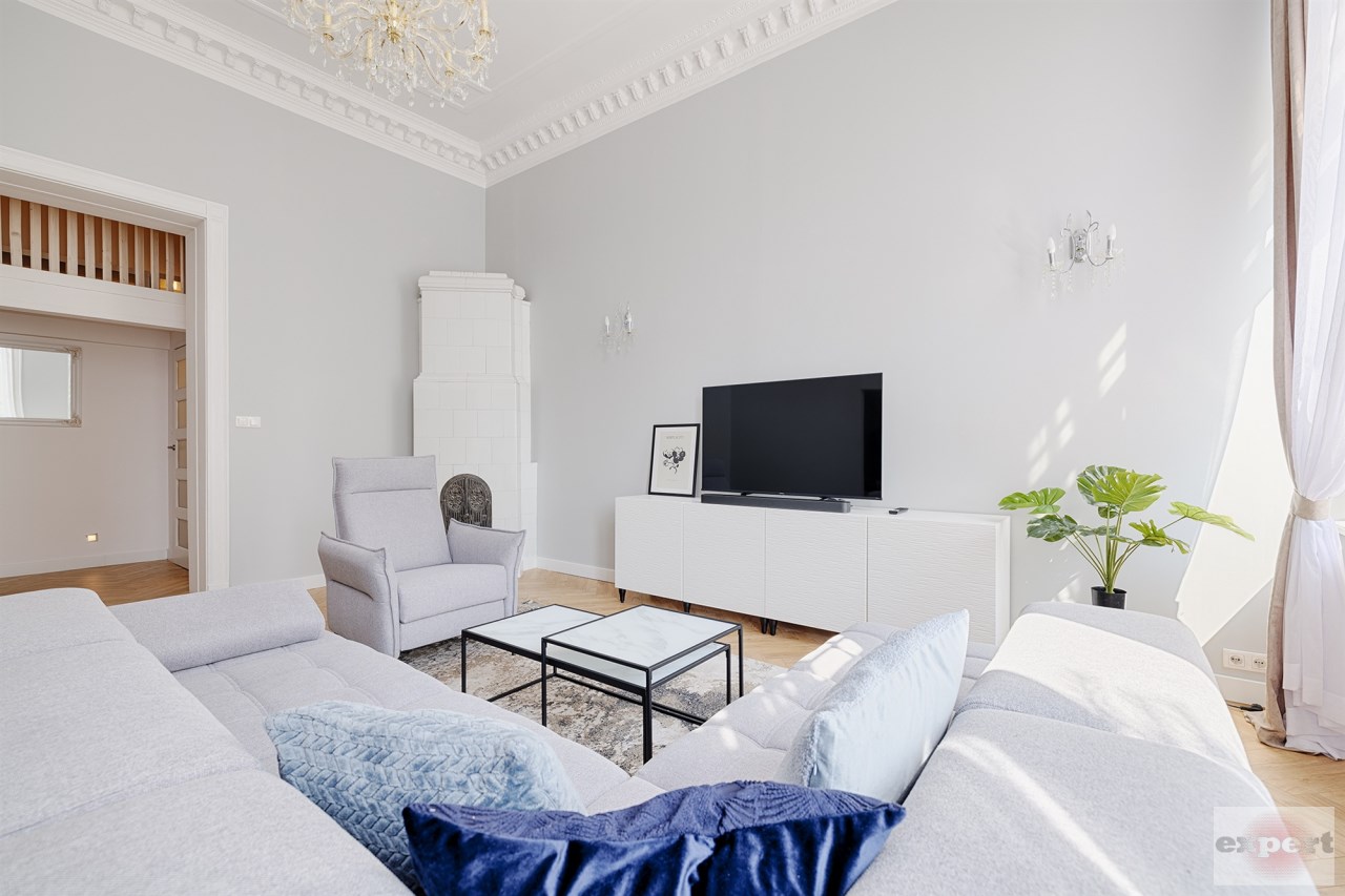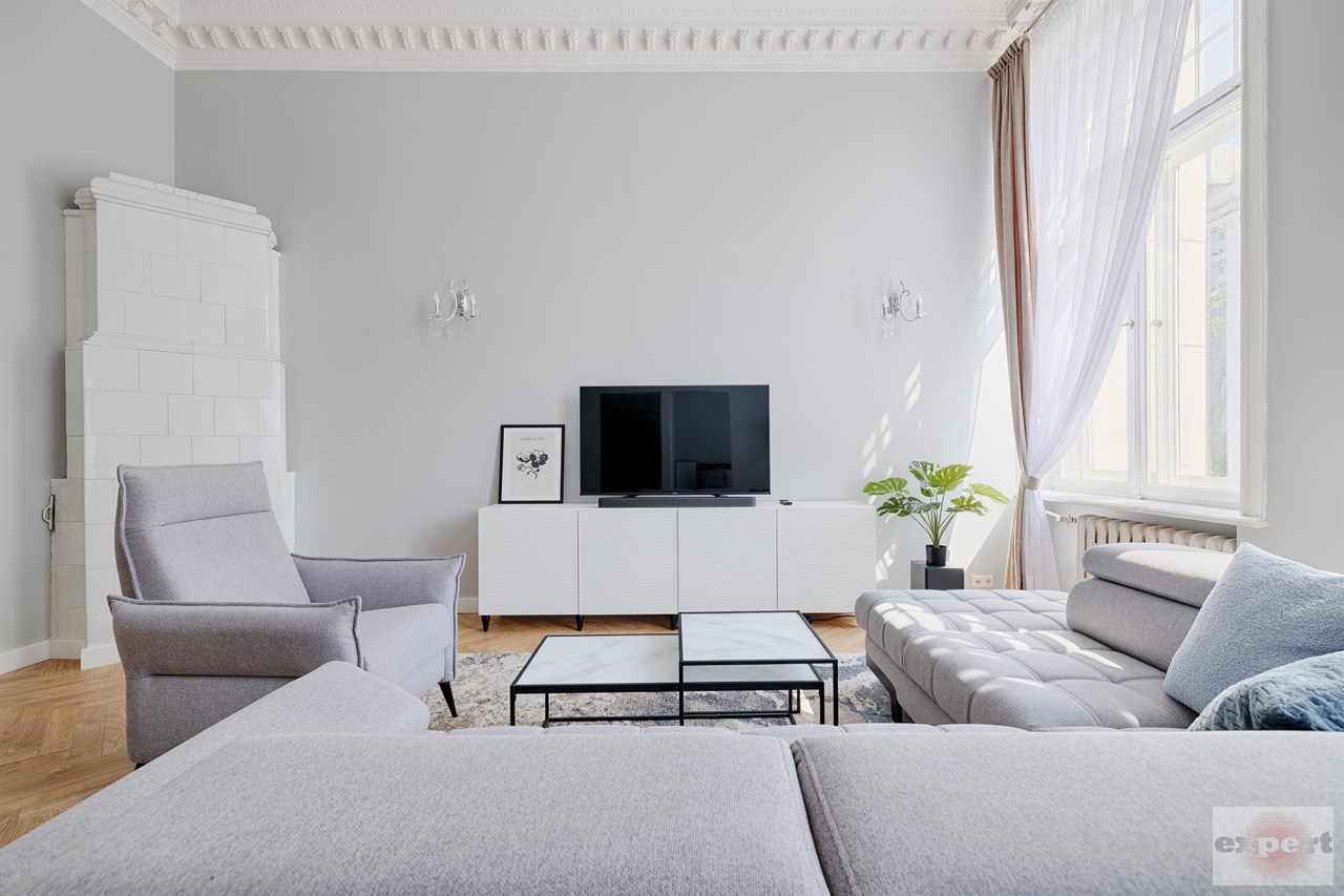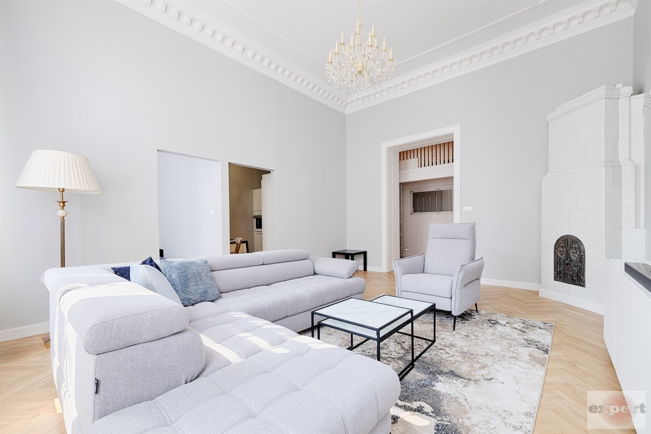 W mieszkaniu są oryginalne sztukaterie i unikatowy piec kaflowy.
