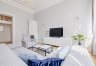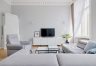 Salon: sofa narożna z funkcją spania, fotel rozkładany, komoda, dwa stoliki kawowe, dywan, telewizor 55 " z funkcją smart TV, nagłośnienie - listwa i sound bar JBL.