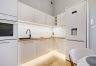 Kuchnia: meble - zabudowa na wymiar, stół okrągły, krzesła, zmywarka, piekarnik, płyta indukcyjna, lodówka z podajnikiem wody, zastawa stołowa, garnki.
