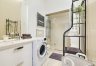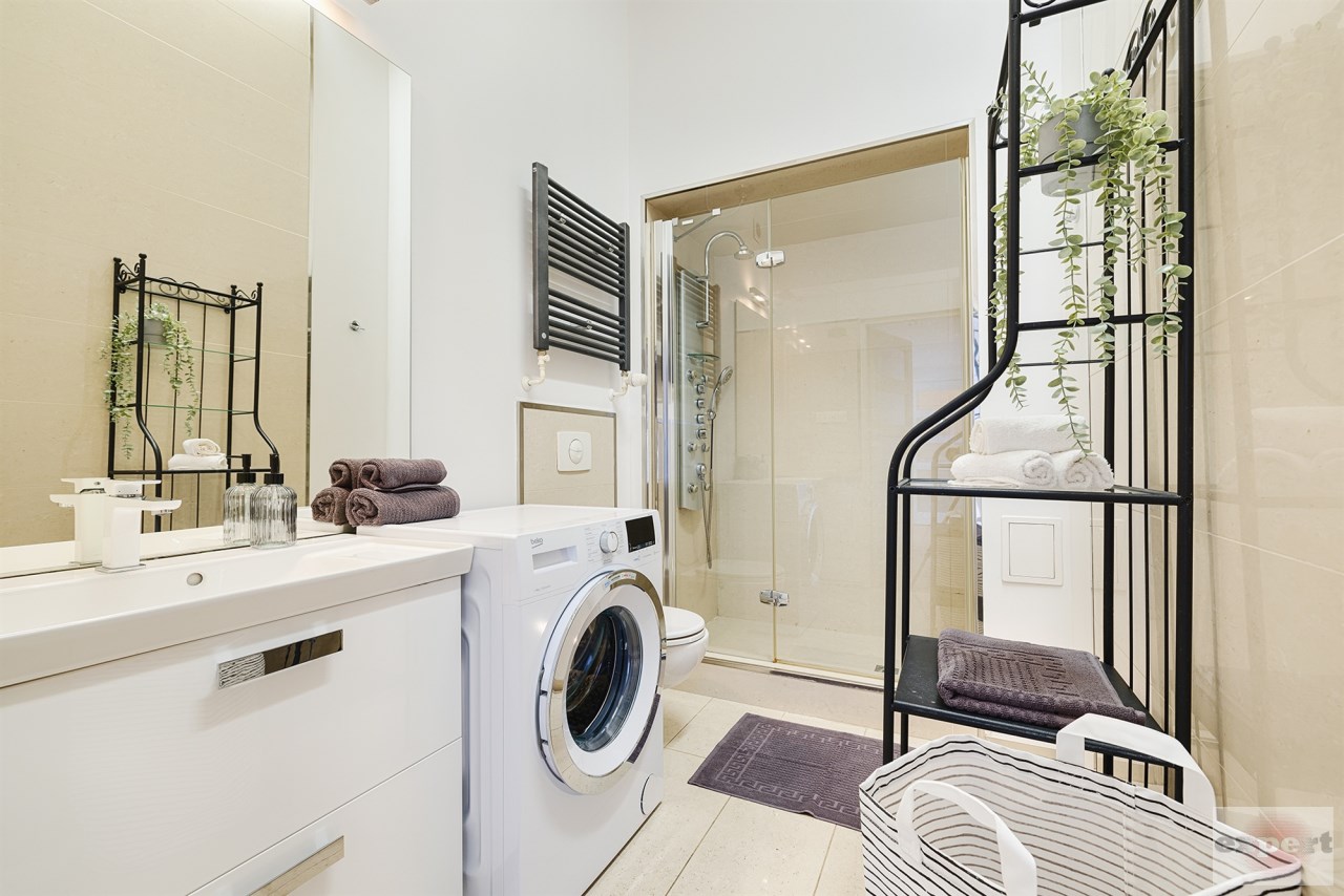 Łazienka: duża kabina natryskowa, pralka, umywalka z szafką, lustro, regał.