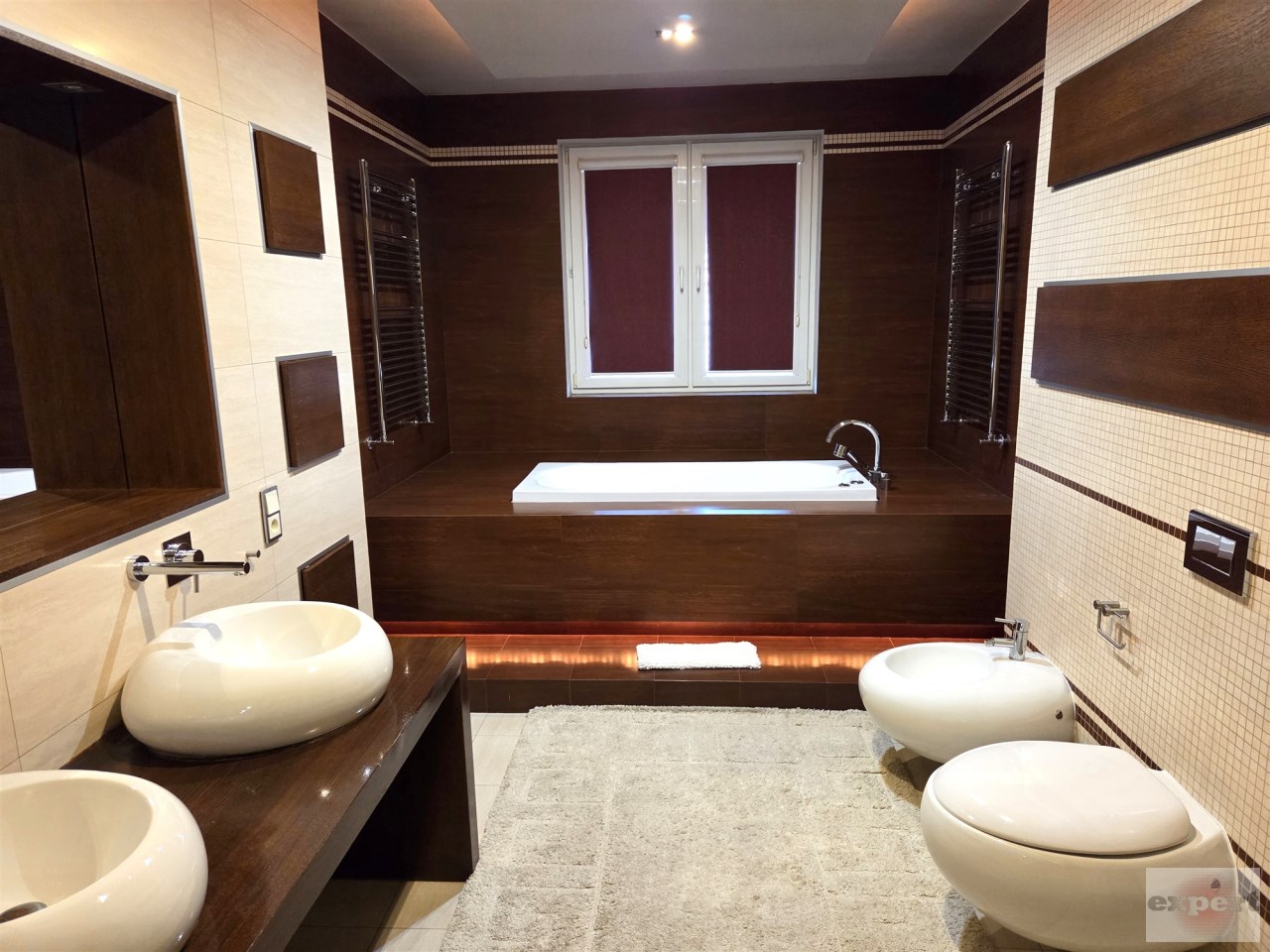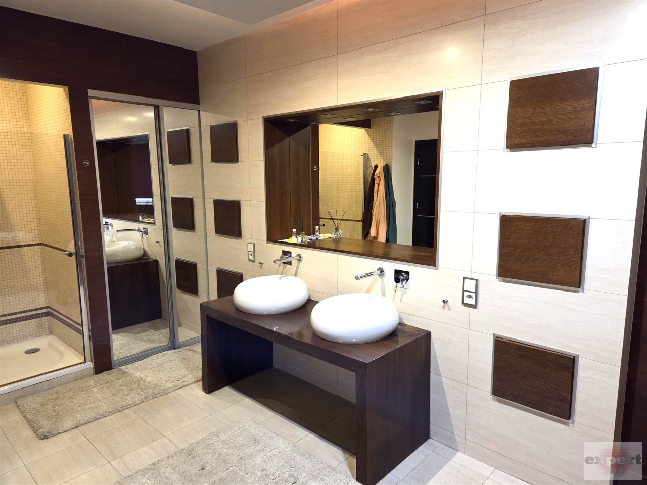 - pokój kąpielowy o powierzchni ok. 16 m2, wyposażony w wannę, prysznic, dwie umywalki oraz bidet.