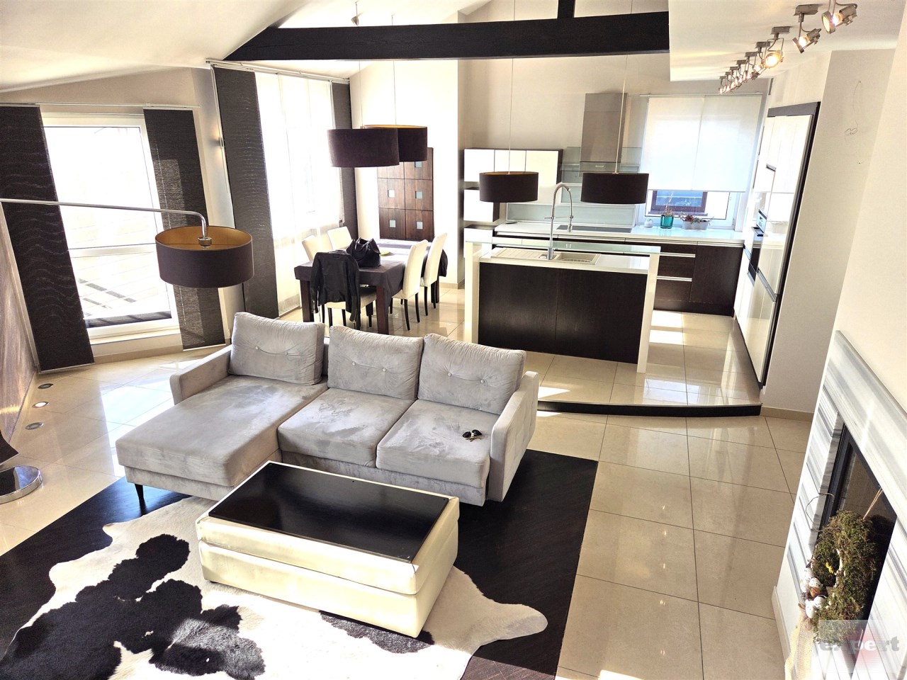 - obszerny salon z kominkiem o powierzchni prawie 29 m2 z wyjściem na duży balkon,