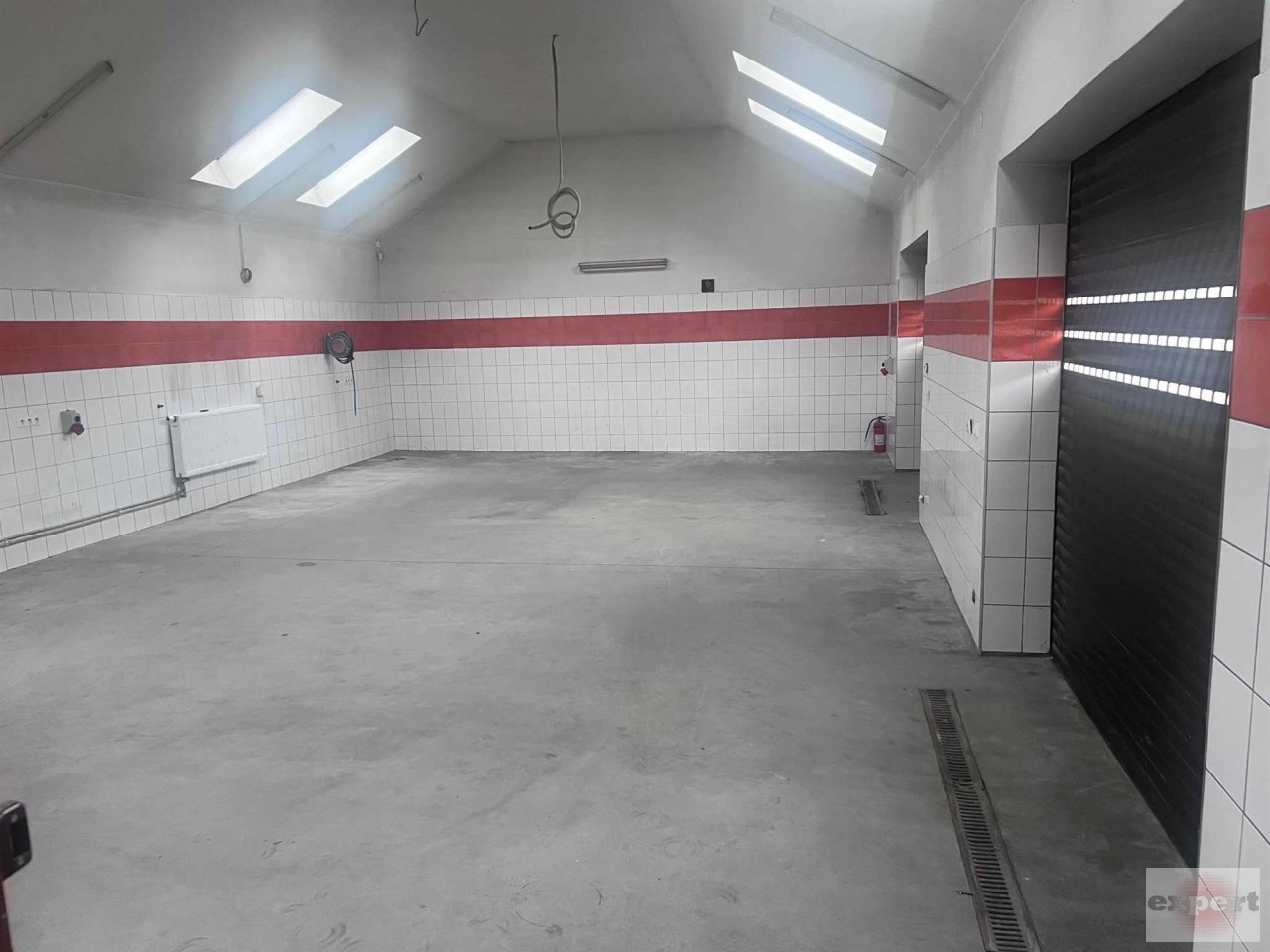Ściany wyłożone płytkami. Kratki odpływowe w posadzce wyłożonej z żywicy i betonu.