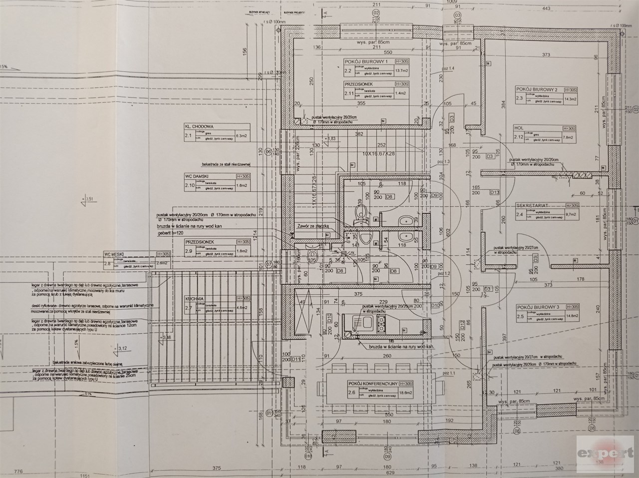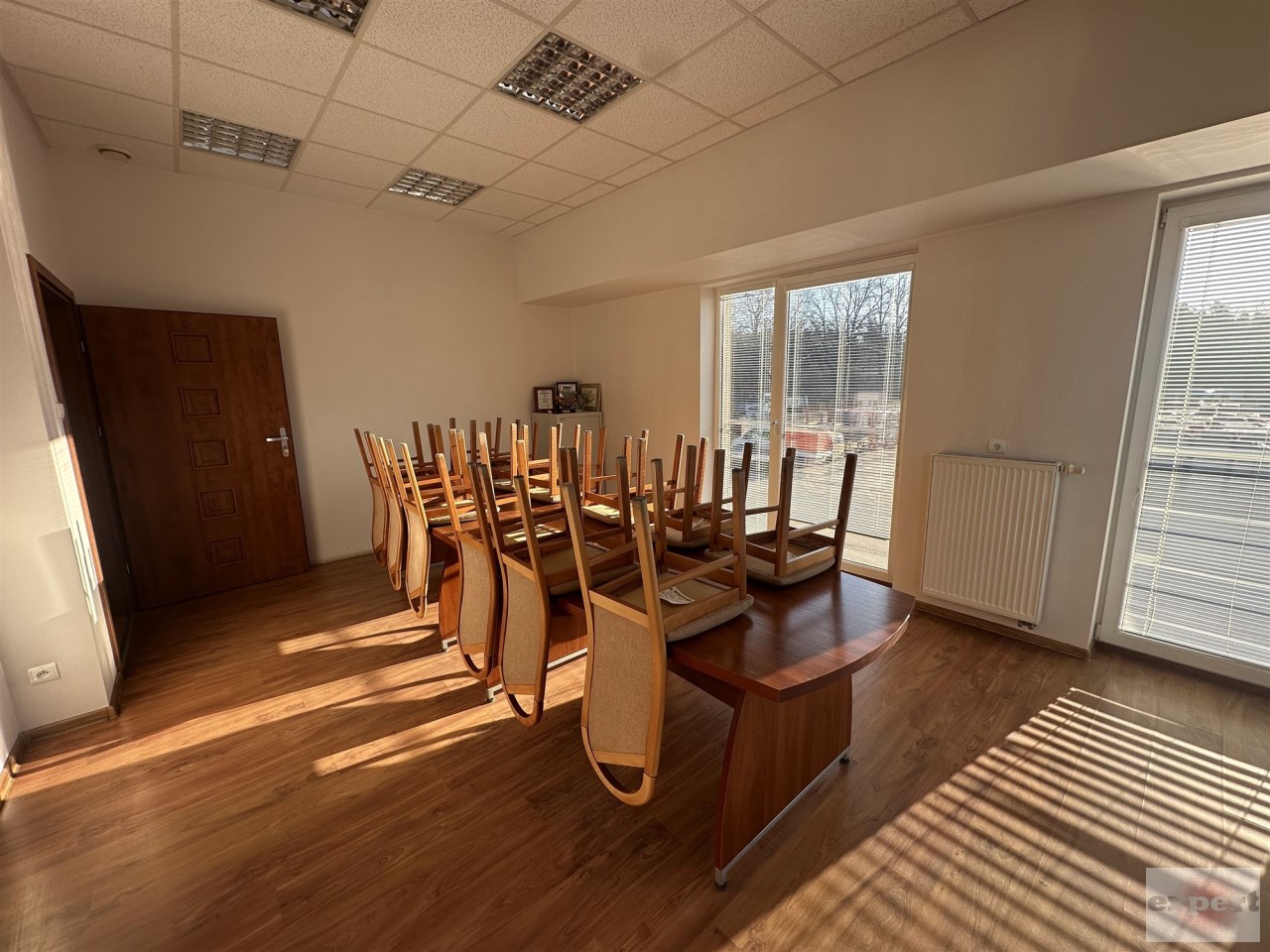 Na pierwszym piętrze otwarty aneks kuchenny, 3 biura, sala konferencyjna na ok. 30 osób z kuchnią, łazienka damska i męska,