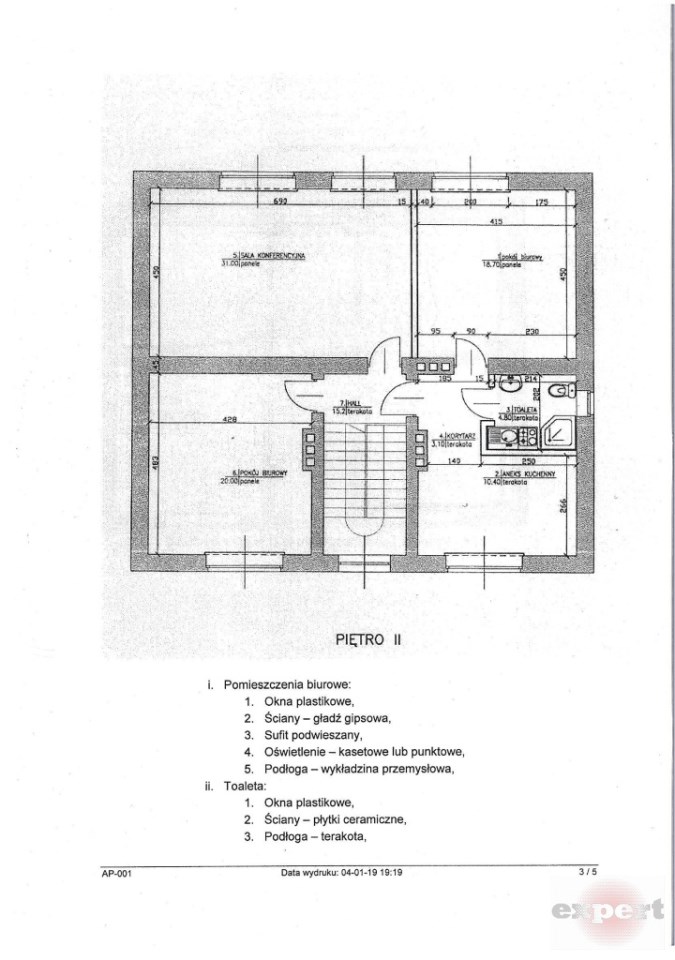 II PIĘTRO - 103,20 m : sala konferencyjna, 2 pokoje, pomieszczenie socjalne - KUCHNIA, WC z prysznicem,